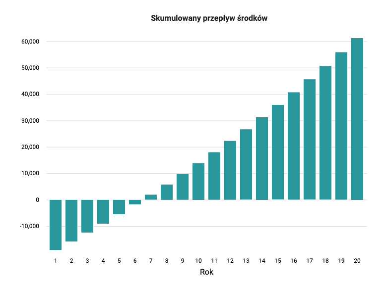Poniżej przedstawiamy przykładową kalkulację poniesionych kosztów na instalację systemu fotowoltaiki oraz zysków, które przyniesie nam jej praca w przeciągu 20 lat od daty uruchomienia. Są to dane dla statystycznej rodziny, której rachunki miesięczne za energię elektryczną to 300zł a koszt instalacji wyniósł 27.200,00zł. Zawiera ona również uzyskaną ulgę na montaż odnawialnego źródła energii. Zwrot z inwestycji pojawia się nam w szóstym roku eksploatacji a całkowity przewidywany zysk (rozumiany jako niezapłacone rachunki) z produkcji przez 20 lat to kwota ponad 60.000,00zł.
